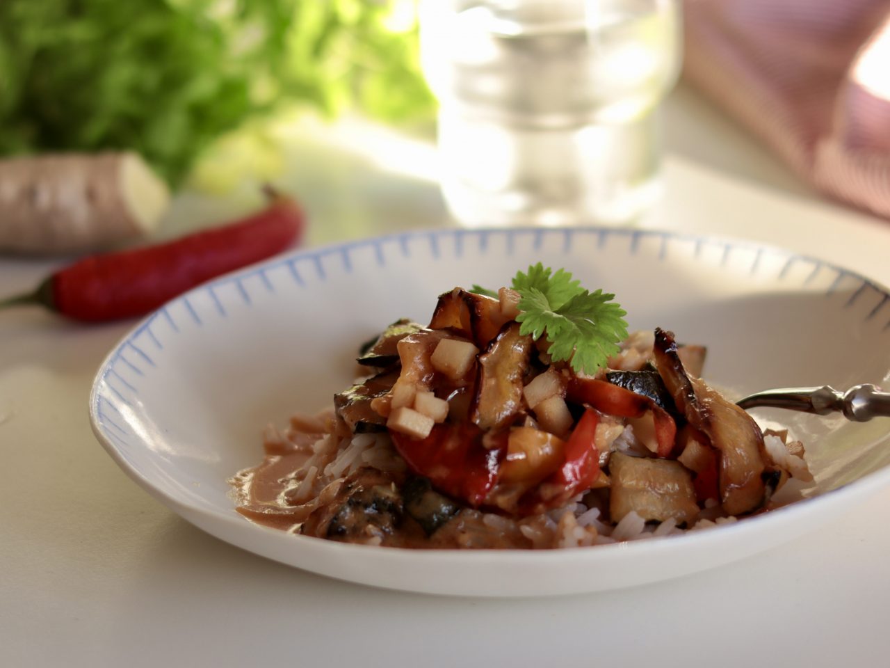 Varm og god karrigryte med ingefær, østerssaus og koksmelk. Det passer godt med Loprofin ris til denne.