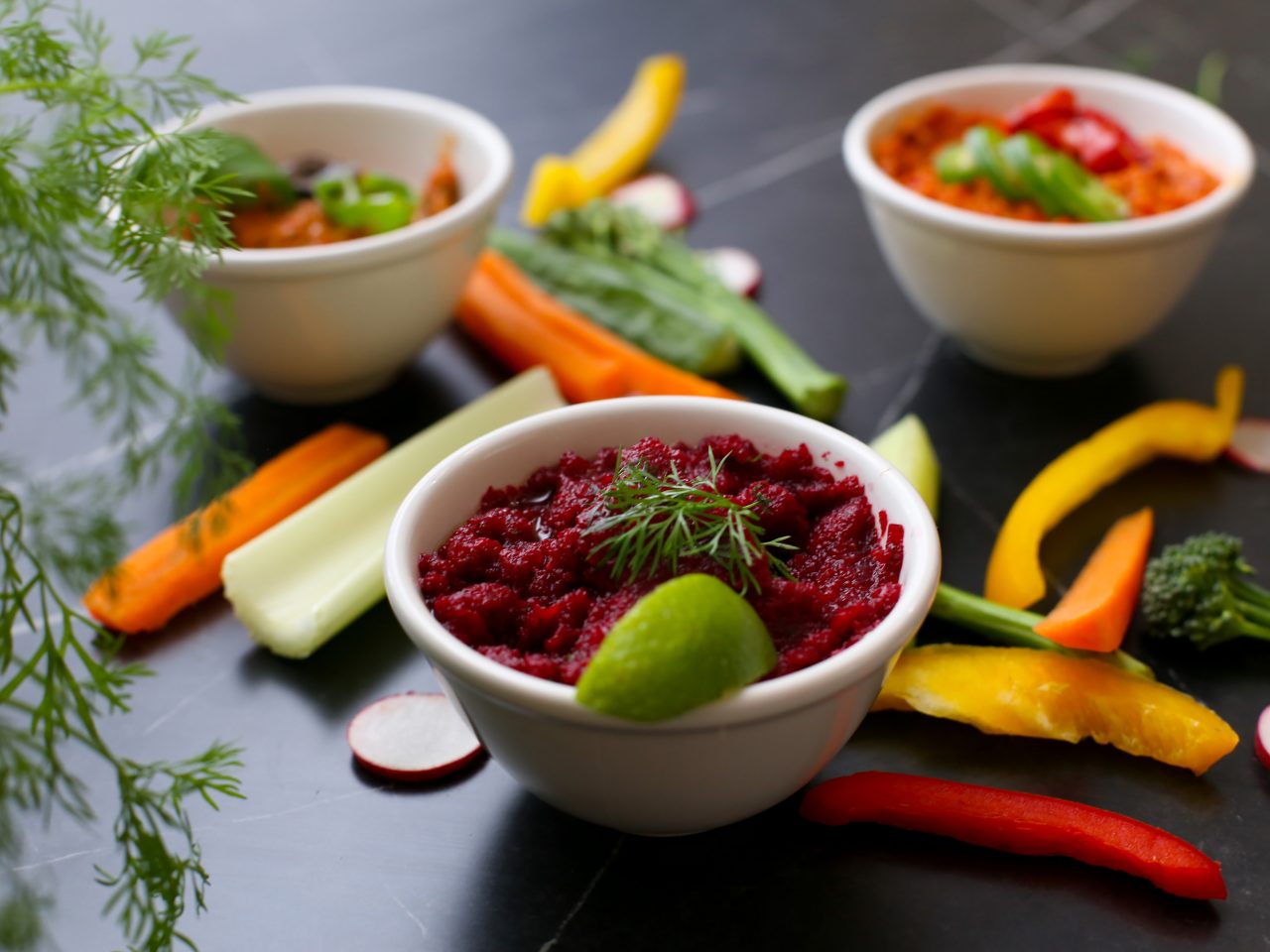 Hummus er en kremet og smakfull dip eller pålegg som stammer fra Midtøsten. Her viser vi en som er laget med rødbeter og lime. Bland PKU GMPro Mix-In pulveret inn i hummusen.