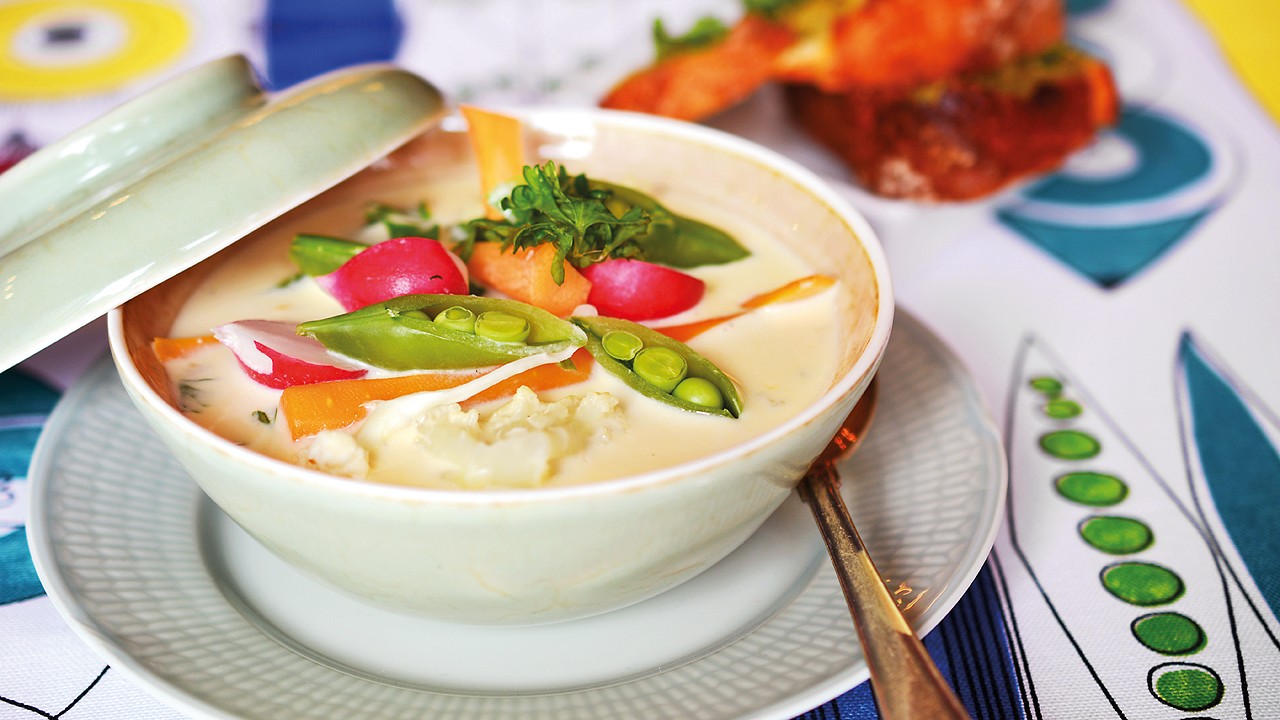 2. Rens gulrøttene. Hakk gulrøttene og blomkålen i mindre biter. Ha dem i kasserollen og la det småkoke under lokk i 5 minutter. Salatløken i skiver, del reddikene og sukkerertene. Sett til siden.