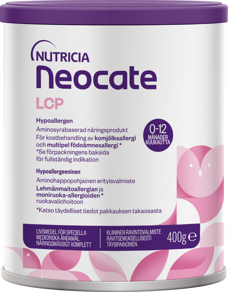 Neocate LCP er en hypoallergen, aminosyrebasert spesialnæring for spedbarn fra 0 til 1 år med kompleks kumelkproteinallergi eller multimatvareallergi. Den er basert på frie aminosyrer (proteinets minste bestanddeler) og inneholder ikke melk i det hele tatt. Neocate LCP inneholder alle næringsstoffene et spedbarn trenger, og er et trygt valg for barn med særlig krevende allergisymptomer.